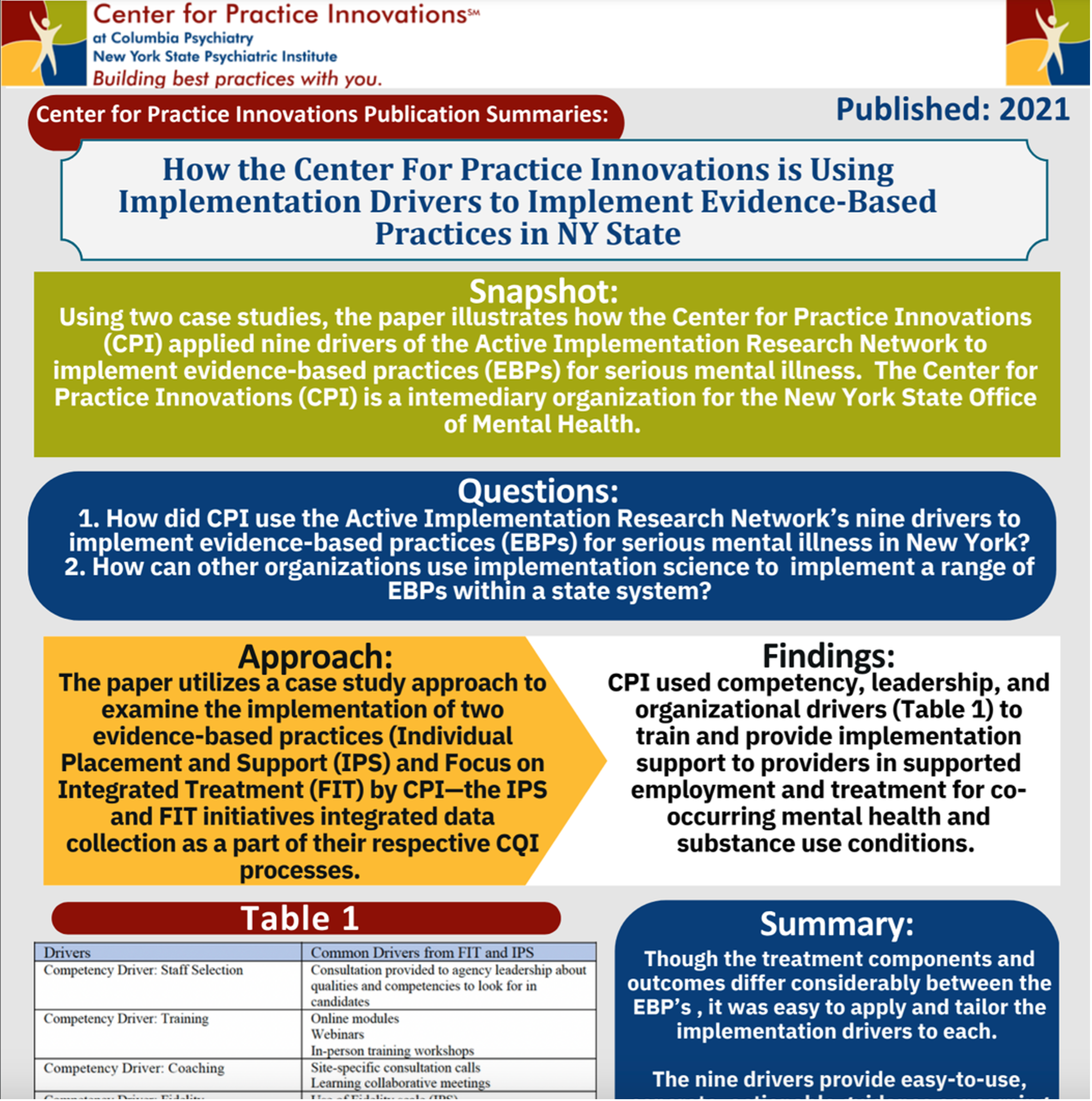 At the Center for Practice Innovations, we think it's important to share what we learn in our work. Below are our CPI Publication Summaries, which are brief one-page summaries of peer-reviewed publications based on quality improvement or research conducted at CPI. Check them out!